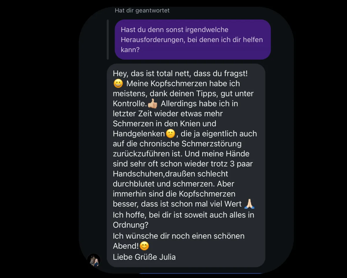 Als Unternehmerin oder Selbstständige kannst du nicht einfach ausfallen. Dein Business läuft weiter, egal ob du Kopfschmerzen hast oder nicht. Und genau deshalb ist es so wichtig, eine nachhaltige Lösung zu finden. Ich habe als Physiotherapeutin, Osteopathin und Heilpraktikerin viele Techniken und Methoden gelernt, die mir geholfen haben, meine Kopfschmerzen langfristig in den Griff zu bekommen. Heute sind sie zur Ausnahme geworden – und das war für mich ein entscheidender Wendepunkt.